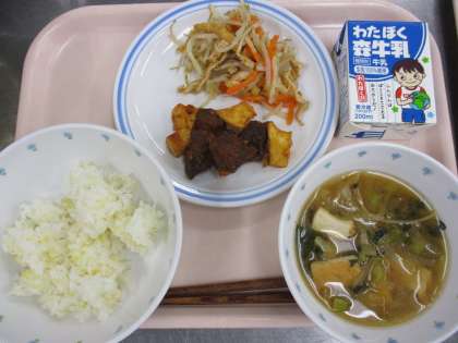 10月22日 きびごはん レバーとじゃがいもの甘辛煮 もやしの甘酢和え 江戸菜のみそ汁 牛乳