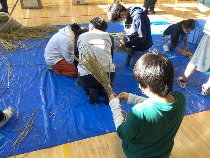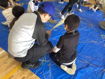余った藁を、毛糸でくくりながら編んでいきます。細かい作業なので難しいですが、みんな真剣に取り組んでいます。