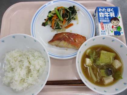 10月28日 麦ごはん 赤魚の幽庵焼き 磯香和え さつまいものみそ汁 牛乳 公開日 2021/10/28 更新日 2021/10/28 給食 10/28 ≪献立≫ ●麦ごはん ●赤魚の幽庵焼き ●磯香和え ●さつまいものみそ汁 ●牛乳 ≪使用食材・産地≫ ゆず(高知)、にんじん(北海道)、さつまいも(千葉)、白菜(長野)、長ねぎ(秋田)、もやし(神奈川)、小松菜(東京) いいね(0)