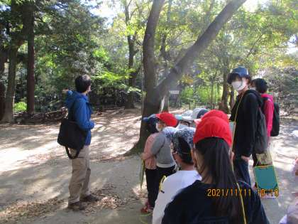 11月11日(木)2年生とあすなろ学級2年生が生活科の学習で駒場野公園まで歩いて行きました。秋を探しに行きました。淡島通りを渡ると、色付いた木々が見え始め、熟れた柿の匂いも感じられました。駒場野公園では、3つのゾーンに分かれて活動しました。解説員の方のプログラムでは、植物の名前や動物の生態などを詳しく教えていただきました。