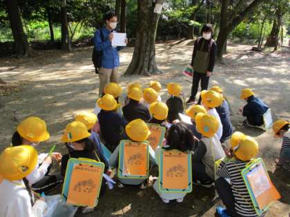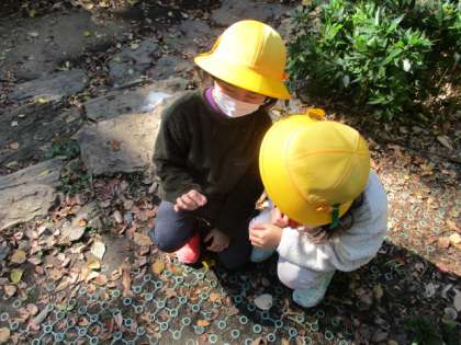 いろいろな場所を回りながら、自由に葉っぱや木の実を集めました。「ハートの形の葉っぱがある」「面白い木の実、見つけた」とあちらこちらから歓声が聞こえました。落ち葉がたまっているところに足を入れた時は「あったかい」「ふわふわしている」、たくさんの葉っぱを入れた袋を見せながら「葉っぱ博士になれそう」「葉っぱのまくらになりそう」。こすり絵をしながら「葉っぱの形が出てきた。楽しい!」と、体全体を使って秋を感じていました。解説員の方にも、たくさんのことを教えていただき、いつもとは違った視点で植物を見ることができました。これから、拾ってきた秋の宝物を使ってどんな作品が出来上がるのか楽しみです。