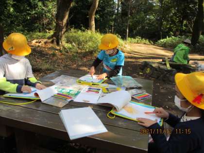 11月12日(金)1年生とあすなろ学級1年生が、生活科の学習で秋を探しに、駒場野公園に行きました。探検ゾーン、こすり絵ゾーン、解説員の方との学習ゾーンの3つに分かれて活動しました。