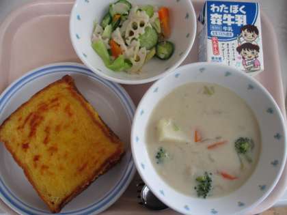 12月1日 オレンジフレンチトースト クリームシチュー れんこんサラダ 牛乳
