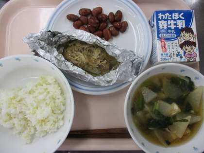 12月2日 きびごはん ホキのホイル焼き 煮豆 大根のみそ汁 牛乳