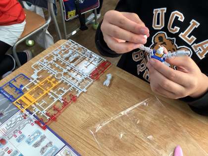 株式会社バンダイさんの協力のもと、プラモデルができる工程を映像から学びました。そして、プラモデル作り体験をしました。作ることの楽しさと大変さを感じたことと思います。