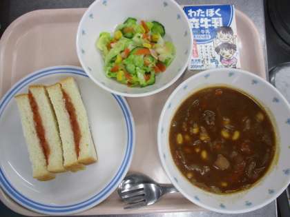 12月8日 手作りりんごジャムサンド ビーンズシチュー フレンチサラダ 牛乳