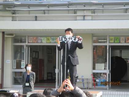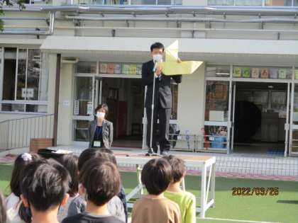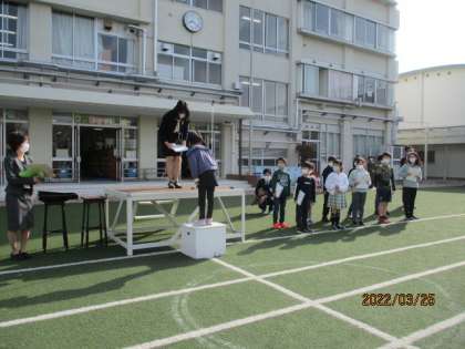 校庭で修了式を行いました。各クラスの代表が、校長先生から修了証をいただきました。その後生活指導主任の先生から、大きな船の折り紙を使って、春休みの生活についての話がありました。安全に気を付けて、健康に過ごしてほしいと思います。