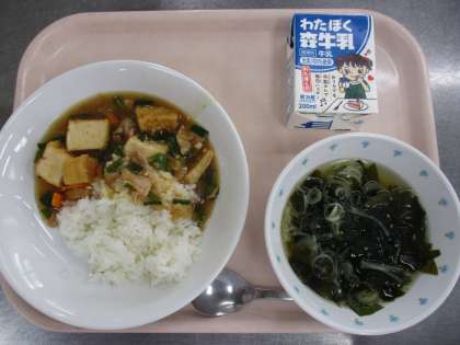 4月13日 家常豆腐丼 わかめスープ 牛乳