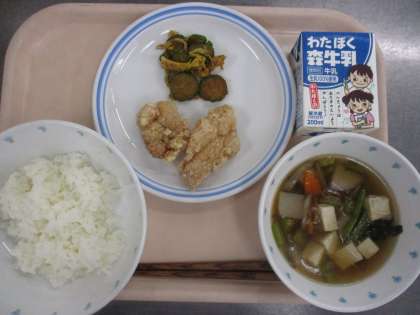 4月23日 ごはん 鶏肉と塩唐揚げ きゅうりとキャベツの土佐漬け けんちん汁 牛乳 公開日 2022/04/27 更新日 2022/04/27 給食 4/23 ≪献立≫ ●ごはん ●鶏肉の塩唐揚げ ●きゅうりときゃべつの土佐漬け ●けんちん汁 ●牛乳 ≪使用食材・産地≫ 鶏肉(北海道)、きゅうり(宮崎)、キャベツ(神奈川)、にんじん(徳島)、ごぼう(青森)、大根(千葉)、さといも(埼玉)、小松菜(埼玉)、長ねぎ(千葉) いいね(0)