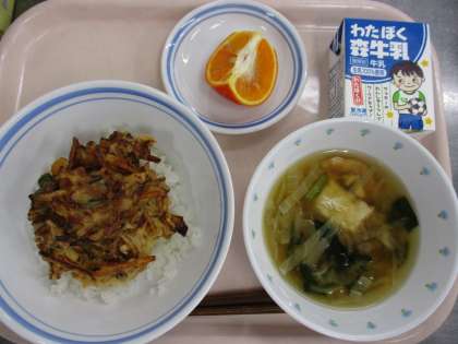 4月27日 かき揚げ丼 キャベツのみそ汁 セミノール 牛乳 公開日 2022/05/06 更新日 2022/05/06 給食 4/27 ≪献立≫ ●かき揚げ丼 ●キャベツのみそ汁 ●セミノール ●牛乳 ≪使用食材・産地≫ たまご(秋田)、切干大根(宮崎)、セミノール(三重)、玉ねぎ(北海道)、さつまいも(千葉)、にんじん(徳島)、グリーンピース(鹿児島)、玉ねぎ(長崎)、キャベツ(愛知)、小松菜(埼玉)、ちりめんじゃこ(愛知) いいね(0)