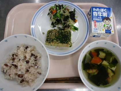 5月16日 赤飯 松風焼き 磯香和え すまし汁 牛乳