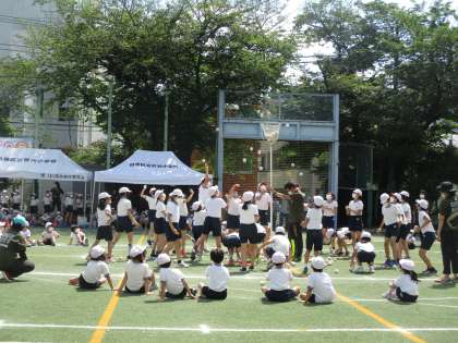 1年生と6年生が4,5名のグループになる「きょうだいさん」という取組をしています。玉入れの競技でも、きょうだいさんと一緒に入場して、お互いに応援していました。第3回戦は6年生だけの本気の玉入れでした。1年生の声援を受けて、6年生がはりきってダンスをしたり、玉を投げたりしていました。