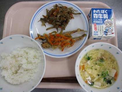 6月14日 麦ごはん ししゃもの南蛮漬け 金平ごぼう かき玉汁 牛乳