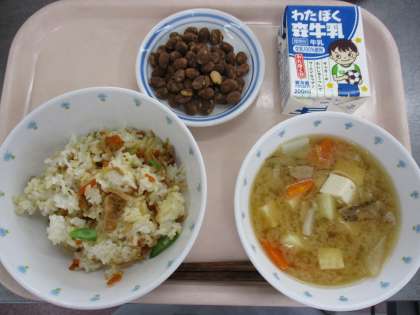 6月5日 切干ごはん 豚汁 ココア豆 牛乳 公開日 2023/06/05 更新日 2023/06/05 給食 6/5 ≪献立≫ ●切干ごはん ●豚汁 ●ココア豆 ●牛乳 ≪使用食材・産地≫ にんじん(千葉)、いんげん(千葉)、にんじん(千葉)、ごぼう(青森)、大根(青森)、じゃがいも(長崎)、長ねぎ(埼玉) いいね(0)