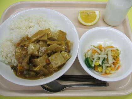 献立 :家常豆腐丼(かじょうどうふどん)大根サラダ ニューサマーオレンジ