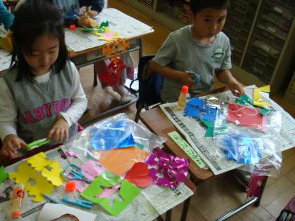 1年生は図工で、いろがみをはさみで切ってかざりを作りました。はさみで切る時には、刃のどこを使ったら良いのか、カーブを切るときは紙を動かすと良いことなど、楽しく学んで、すてきな作品を仕上げていました。三角折りで、四角折りで、二つ折りで線をひいて、切り込みをいれると・・・。紙を広げた時の、思いがけない模様に「うわあ。」といくつも歓声があがりました。