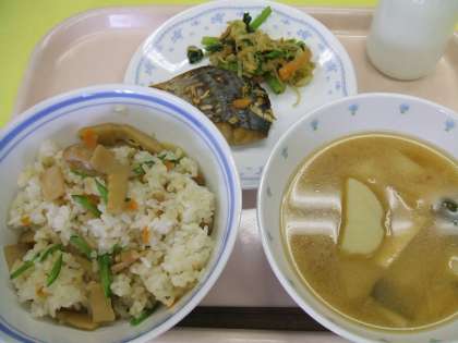 献立 :たけのこご飯 じゃが芋のみそ汁 サワラの香味焼き ごまあえ 牛乳