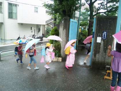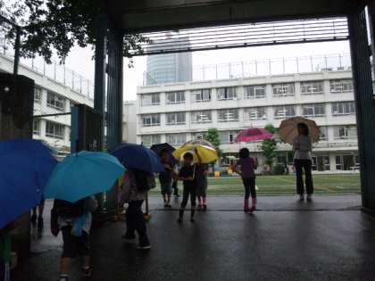今日から学校公開です。あいにくの雨ですが1年生の挨拶隊は元気いっぱいです。