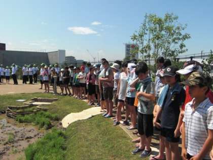 昔の米作りの講義を受けた後、社長様、目黒区副校長様、代表児童による除幕式です。