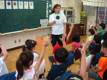 いっきにテンションがあがり、ノリノリに!英語の歌にあわせて、踊ったり、歌ったり。そのあと、英語の色を教えてもらい、ゲームをしながら、覚えました。