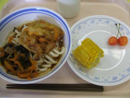 献立 :ひやしかきあげうどん とうもろこし さくらんぼ 牛乳