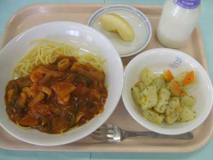 献立 :スパゲッティ海の幸ソース ポテトソテー りんご 牛乳