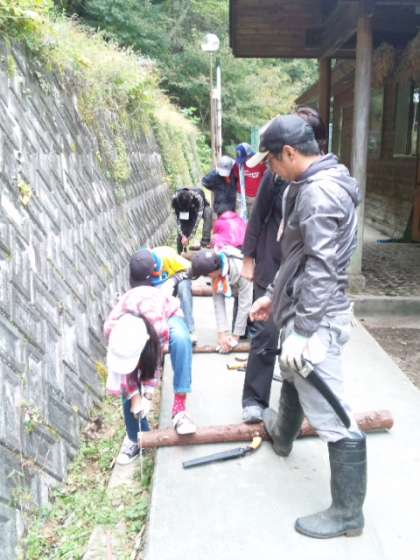 続いて、はし作りと丸太を切ったコ−スタ−作りです。このあと自分たちで収穫したものをみそ汁や漬物でいただき、東京へむかいます。