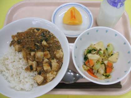 献立 :マーボー豆腐丼 中華風野菜 柿 牛乳