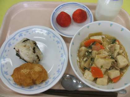 献立 :昆布おにぎり ぼたもち 五目豆腐 いちご 牛乳