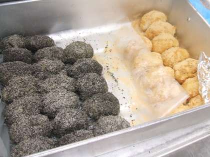 今日は、春の彼岸のぼたもちです。黒ごまときなこを選んでもらいました。