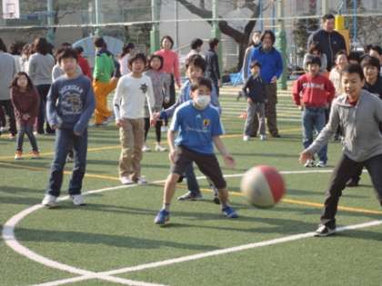3つのコートに分かれ、1・2年生対6年生、3・4年生対6年生、5年生対6年生で勝負をしました!