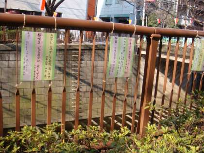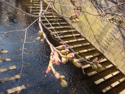 目黒川の桜がもうすぐ咲きそうです。つぼみがピンク色になって、大きくふくらんできました。そのまわりに、菅刈小学校の子どもたちが書いた俳句が飾られています。春を待つ気持ちや、新学期にむける思いが表れています。お花見の時に探してみてくださいね。