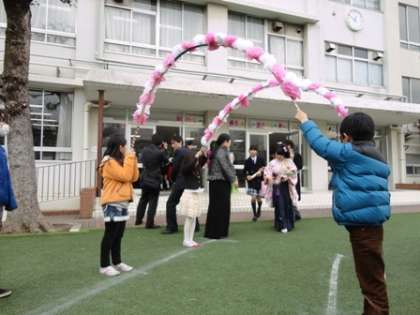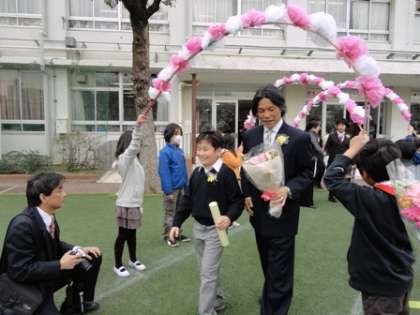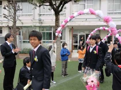 最後は在校生や保護者、地域の方々、教職員に見送られながら、校庭で花のアーチをくぐり正門を出て行きました!