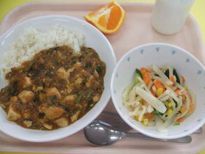 献立 :マーボー豆腐丼 大根サラダ 清見オレンジ 牛乳