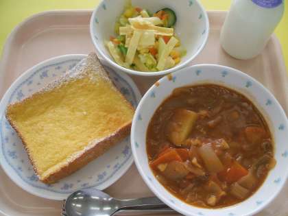 献立 :フレンチトースト タラのトマトシチュー パリパリサラダ 牛乳