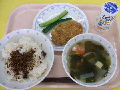 献立 :おかかふりかけごはん すまし汁 肉じゃがコロッケ 一塩きゅうり