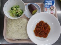 ≪献立≫●ソフト麺●ミートソース●豆入りサラダ●焼き芋●牛乳≪使用食材・産地≫に...