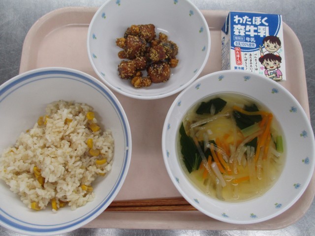9月12日 給食 公開日 2025/09/12 更新日 2025/09/12 給食 ★こんだて★とうもろこしごはん、かつおと豆のごまがらめ、沢煮椀、牛乳★産地★コーン(北海道)かつお(近海)しょうが(高知)にんにく(青森)にんじん(北海道)ごぼう(群馬)糸こんにゃく(群馬)大根(青森)小松菜(栃木) いいね(0)