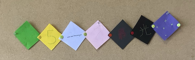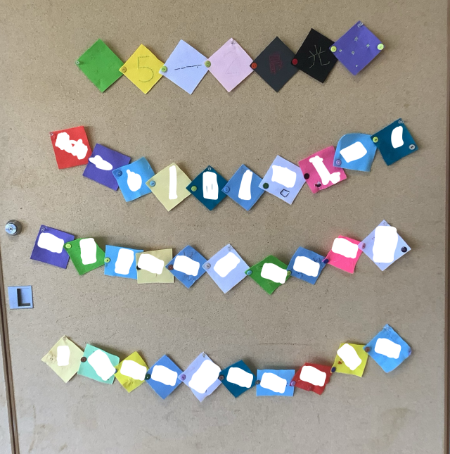これは5年2組が家庭科の時間、作った布に糸で名前を縫ったネームプレートです。また、ネームプレートにはボタンがつけてあります。場所は2階のかまぼこステージの近くで、わりと目立たない所にありますが、ぜひ来て見てみてくださいね。