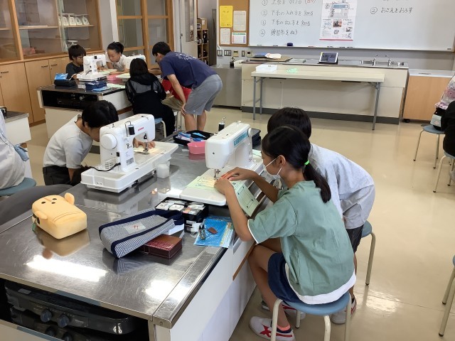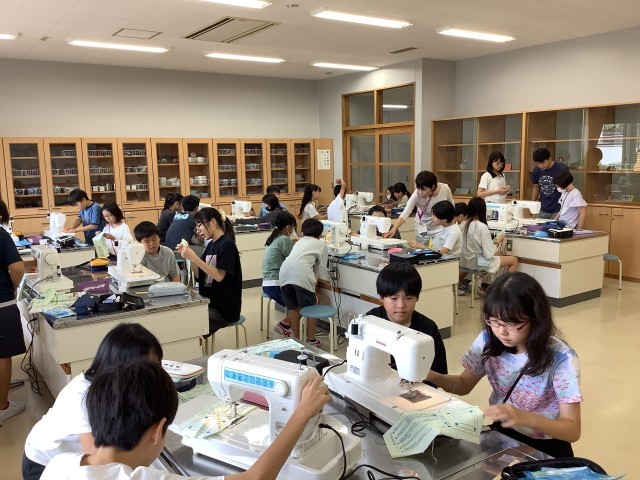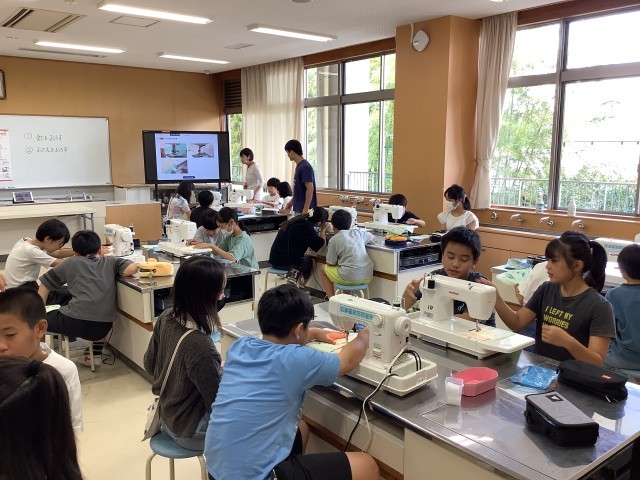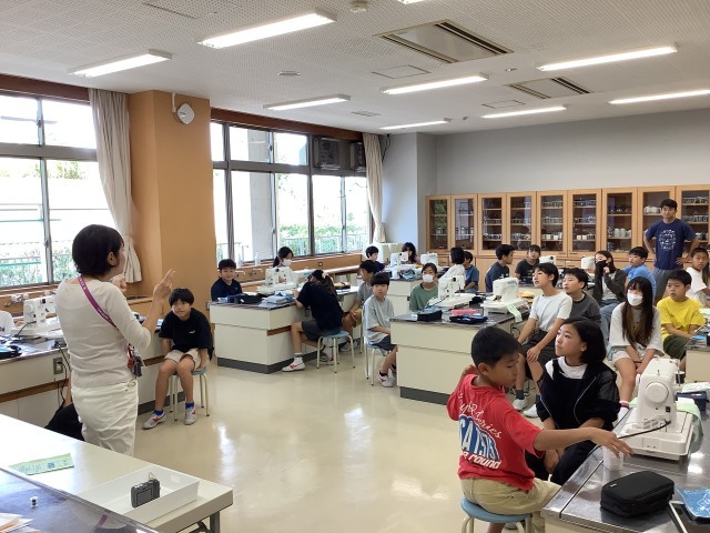 ミシンの学習が始まりました。まずは上糸、下糸をセットして、まっすぐに縫う練習です。みんな熱心に取り組んでいました。