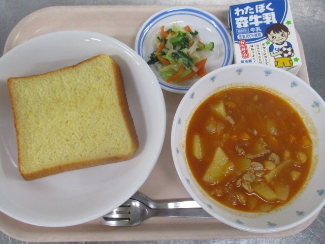 フレンチトースト、ポークビーンズ、小松菜サラダ、牛乳