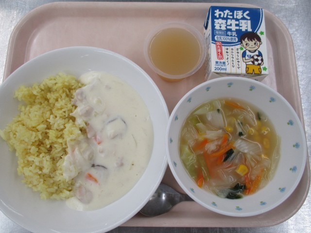 令和7年10月8日 公開日 2025/10/08 更新日 2025/10/08 給食 ★こんだて★カレーピラフきのこソース、ホールコーンスープ、ももゼリー、牛乳★産地★鶏肉(岩手)しめじ(長野)エリンギ(長野)えのきだけ(新潟)にんじん(北海道)たまねぎ(北海道)ホールコーン(北海道)キャベツ(群馬)小松菜(東京) いいね(0)