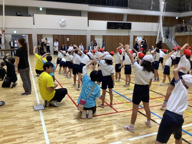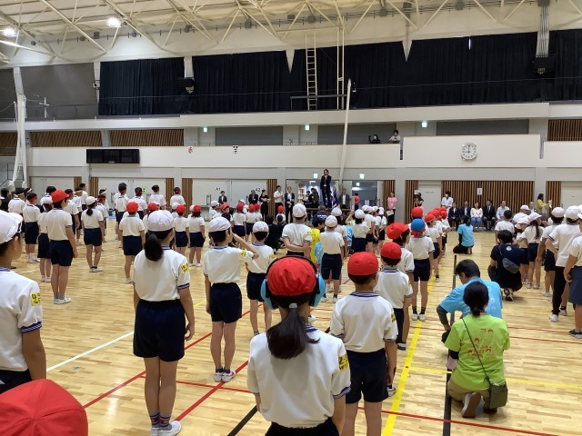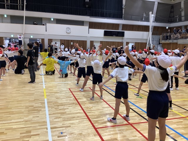 区内7校の小中学生が集まり開会式を行いました。開会式の後、準備体操です。大きく身体を動かしました。準備万端です。