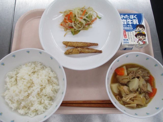 ごはん、わかさぎのカレーあげ、もやしの甘酢、芋煮、牛乳