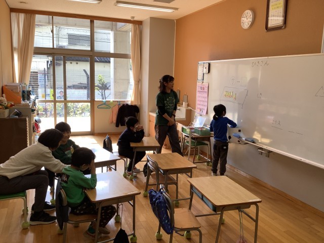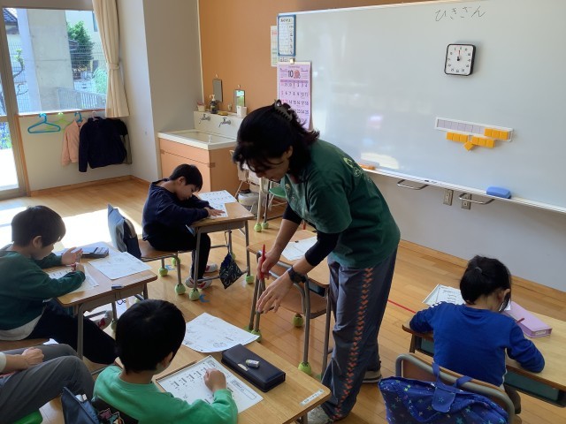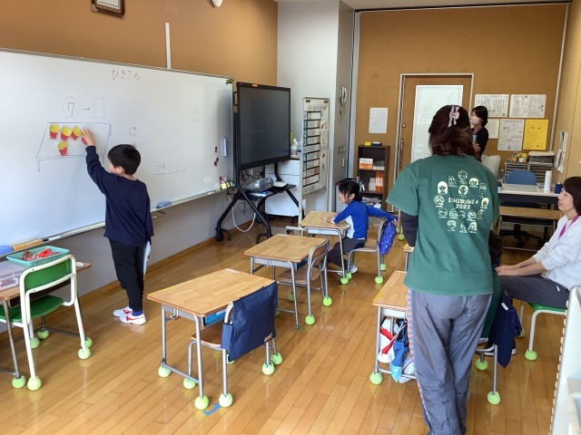 ひき算の学習をしていました。問題作りやプリントでの練習に熱心に取り組んでいました。