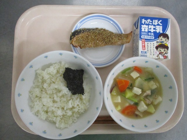 ごはん、のりの佃煮、鮭の南部焼き、さつま汁、牛乳