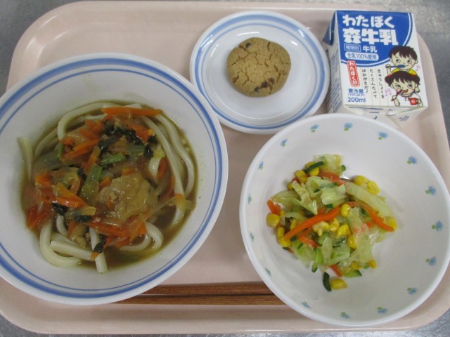 カレーうどん、コーンサラダ、チョコチップクッキー、牛乳
