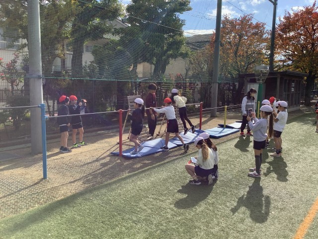 鉄棒を使った運動遊びです。ペアになってタブレット端末で動画を撮影して「逆上がり」の練習をしていました。