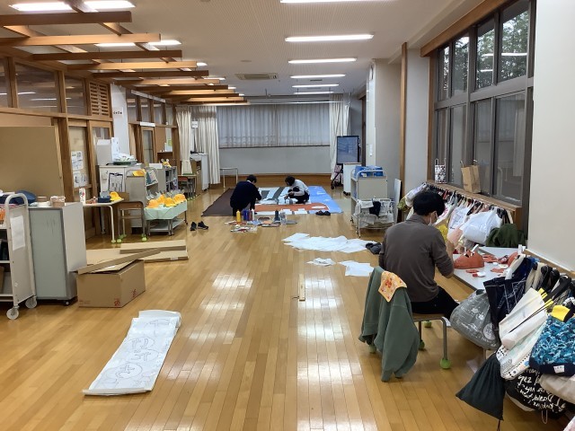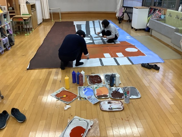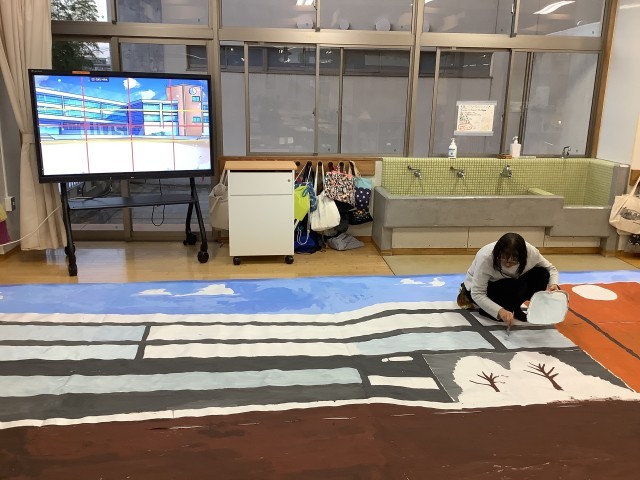 子どもたちが帰った後、4年生の先生方がワークスペースで背景画&小道具作成です。これも「放課後の時間割」の一幕かな!?