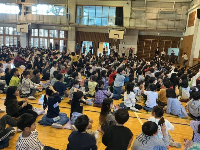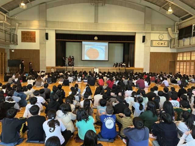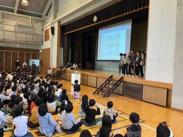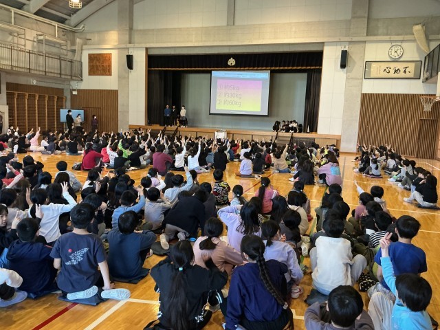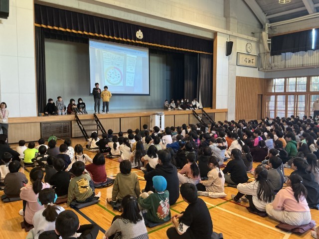 今日の児童集会は、給食委員会の発表でした。給食委員会の仕事内容や給食クイズで盛り上がりました。今日の給食の「もちもちポテト」はジャガイモ420個も使って作ったそうです。
